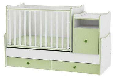 Кровать-трансформер Lorelli Trend Plus new colour white/green изготовлена из натурального дерева с использованием ламинированного ДСП. В качестве лакокрасочного покрытия применена безопасная краска на водной основе. Оснащена маятниковым механизмом, благодаря которому малыша можно укачивать. Передняя часть кроватки опускается. Небольшой камодик, может выполнять роль удобного пеленального столика. При трансформации для ребенка старшего возраста получается удобная кровать с двумя вместительными ящиками, прикроватная тумбочка, а также письменный стол.