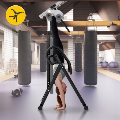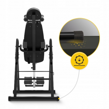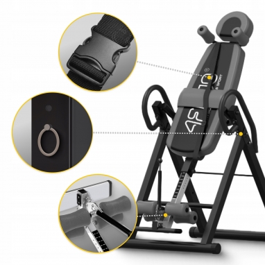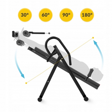 В основі інверсійного тренажера від 4FIZJO використовується високоякісний сталевий профіль, тому максимальне навантаження на конструкцію становить до 150 кг. Обладнання оснащене системою зміни кута нахилу, а завдяки наявній 4-ступеневій шкалі можна плавно перевести лаву в перевернуте положення, обравши кут нахилу - 30°, 60°, 90° або 180°. Більший кут забезпечує кращий розслаблюючий ефект для хребта. Крім того, тренажер має регулювання під зріст користувача з максимальним значенням у 190 см. Якісна та приємна на дотик оббивка з екошкіри наповнена стійкою до деформації, м'якою піною, що гарантує комфорт використання. Закінчивши тренування ви можете з легкістю скласти тренажер та сховати у зручному місці.