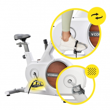 Серце спінінгового велотренажера Cornix Eliza - це моторизована магнітна система (Motorized Magnetic Brake System) з 32 автоматичними рівнями опору, що миттєво змінюються за допомогою електронного регулятора. Аутентичний досвід забезпечують потужний 6 кг маховик з максимально тихою та плавною роботою, ергономічне сидіння та кермо з можливістю регулювання позиції, що імітує аеродинамічну посадку шосейника, а також спортивні педалі з фіксацією. Конструкція витримує до 140 кг ваги (власна маса 31 кг), гарантуючи стабільність навіть під час спринтів. Контрастний LCD-дисплей відображає час, швидкість, дистанцію, ODO, калорії та RPM, а вбудований Bluetooth-модуль синхронізується з додатками SPAX, Kinomap, Zwift для групових віртуальних заїздів, персональних програм та детального аналізу продуктивності.