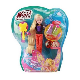 Кукла Winx Волшебные волосы Стелла имеет длинные, густые волосы, для моделирования всевозможных причесок. Для этого в комплект с куклой входят такие аксессуары как краска в специальных тюбиках, гель для волос с блестками, накладной шиньон и расческа. Одета в сильный диско-костюм.