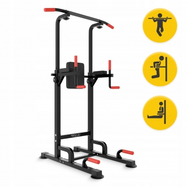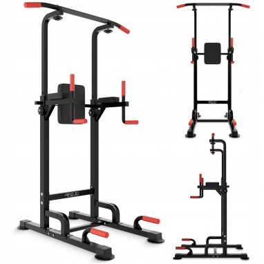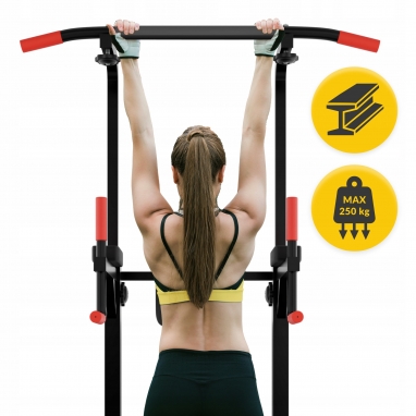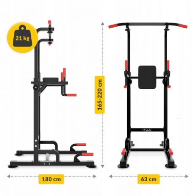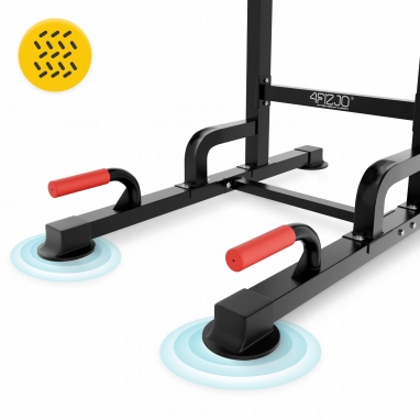 Рама багатофункціональної стійки для тренувань від 4FIZJO виконана з високоякісного сталевого профілю, тому максимальне навантаження на неї становить до 250 кг. Тренажер дозволяє регулювати висоту перекладини в діапазоні від 165 до 220 см, завдяки цьому його можна адаптувати не тільки під зріст користувача та позиціонування рук, але й під власні тренувальні уподобання. Не мало часу виробник приділив питанню безпеки користування обладнанням. Розширена основа сталевої конструкції оснащена ніжками, які працюють за принципом присосок. Завдяки цим особливостям тренажер залишається стабільним навіть при великих навантаженнях. Окрім основного функціоналу, а саме широкої та зручної перекладини для підтягувань, стійка обладнана брусами та упорами для віджимань, а також тренажером для преса. З верстатом можна використовувати різноманітні обтяження, еспандери та петлі, що дозволять корегувати ваші тренування для отримання бажаного результату.