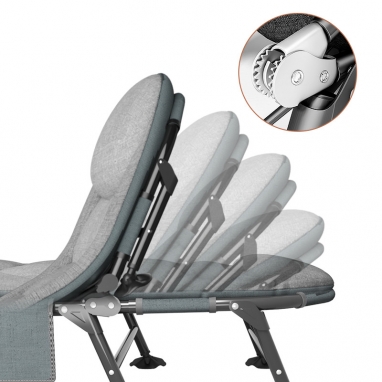 Легко розкладається та складається, ця розкладачка ідеально підходить для кемпінгу, походів та подорожей, надаючи вам можливість відпочити з максимальним комфортом у будь-якому місці. Цей сучасний розкладний шезлонг створений для вашого максимального комфорту та відпочинку. Завдяки автоматичній 5-ступінчастій регуляції спинки ви зможете легко налаштувати нахил спинки, а інтегрована подушка зробить відпочинок ще більш приємним і комфортним.